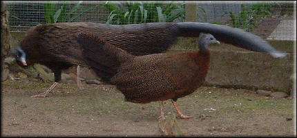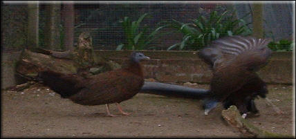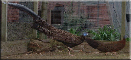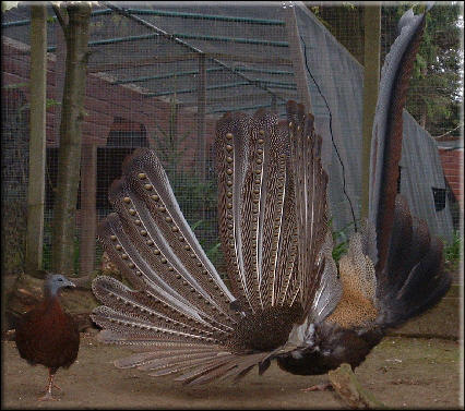 Argus fazanten zijn in 1872 voor het eerst naar Europa gebracht. Ze zijn goed te houden, mits ze over een ruim vorstvrij verblijf kunnen beschikken. Argus fazanten eten weinig of geen groen, we kunnen daardoor van het buitenverblijf een prachtig groen verblijf maken, waar deze vogels zich snel thuis zullen voelen. Als beplanting gebruiken wij bamboe, laurier, hulst en conifeer. Het zijn, nadat ze eenmaal gewend zijn, vrij rustige toch wat afstandelijke vogels. De haan komt het derde jaar tot volle wasdom en is dan geslachtsrijp. De hen legt vaak het tweede jaar al. Het koppel op bovenstaande foto’s had op het tweede levensjaar al een bevrucht ei, waaruit een prima gezond kuiken tevoorschijn is gekomen. Niet alle argus fazanten accepteren elkaar. Wanneer bij een nieuw aangeschaft koppel blijkt dat haan en hen elkaar niet accepteren kan men het beste uitzien naar een andere hen of haan. Het komt voor dat de hen de haan niet tolereert en aanvalt en andersom. Bovenstaande probleem huwelijken zullen nooit bevruchte eieren, laat staan kuikens voortbrengen. Wanneer er een goed koppel samengesteld is kan dit wel meer dan 25 jaar oud worden en in goede harmonie samenleven. De argus fazant hen legt haar meestal 2 eieren graag op een hoger gelegen plaats. Om aan deze behoefte te voorzien, hangen we in het binnen verblijf een royale mand of nest bak van ongeveer 40 bij 40 centimeter op, gevuld met strooisel. Het eerste en eventueel tweede legsel broeden wij in de broedmachine uit. Omdat argus fazanten kuikens de eerste dagen voedsel bij de hen uit de snavel pikken, zullen we bij de kuikens uit de broedmachine voor pleegmoeder moeten spelen. Als start voedsel gebruiken wij Sivo-Start of een ander startvoeder met een royaal eiwit gehalte dat we iets vochtig maken en met een speciaal lepeltje verschillende keren per dag het kuiken aanbieden. Ze zien dit lepeltje al heel snel voor hun moeder snavel aan, en pikken vanzelf het voer van dit lepeltje af. De ondergrond waar we ze op laten lopen is de eerste dagen wit, en bestrooien we met voer. Dit activeert het voedsel pikken van de grond aanzienlijk. Het bijplaatsen van een kuiken van een andere fazanten soort, die wel uit zichzelf van de grond eet, activeert een argus fazanten kuiken ook om van de grond af te pikken. Het water wordt in een laag plat bakje aangeboden, waar we de eerste dagen wat voer op laten drijven, dit trekt de aandacht en het drinken gaat zo vanzelf. Het eventueel derde legsel laten wij door de hen zelf uitbroeden. Door haar zelf te laten broeden houden we het broed instinct bij de nakomelingen instant en is de hen op tijd met haar najaars rui. Het is belangrijk dat de haan en de hen het volgend voorjaar weer een nieuw veren pak hebben en dan niet in de rui vallen. Als de temperatuur in het voorjaar sterk wisselt, is er kans dat deze vogels in de rui vallen. Als in het voorjaar een van de vogels in de rui, valt kunnen we bevruchte eieren wel vergeten. De hen broed zeer vast, en komt zelfs niet van het nest om te eten of te drinken. Wanneer de hen kuikens heeft, is ze van afstandelijk en terughoudend, veranderd in een vel agressief dier die haar kuikens zeer goed verdedigd. Om de hen met haar kuikens voldoende rust te garanderen, laten we de haan in de buiten volière waar hij een zit stok onder een overkapping heeft. Als de kuikens nog klein zijn, zien we regelmatig dat de hen de kuikens onder haar vleugels draagt. In het wild is dit natuurlijk een prima manier om zo rennend met haar kuikens te ontsnappen aan roofdieren. Als de kuikens ongeveer 2 a 3 maanden oud zijn worden ze van de hen gescheiden en mag de haan weer bij de hen. Haan en hen accepteren elkaar direct weer. Na drie maanden buiten te hebben geslapen, gaat de haan in de avond weer op zijn plaats naast de hen, op de zit stok in het binnen verblijf slapen. En is het net of ze niet van elkaar gescheiden zijn geweest. Argus fazanten kuikens groeien zeer langzaam, het binnen een half jaar bepalen of we met een hen of een haan van doen hebben, valt daarom niet mee. Als aanknoop punten kunnen we aangrijpen dat de haan hoger op de poten staat en dikkere poten heeft, de haan heeft ook een zwartere kop en net als zijn vader een grotere kuif op het achterhoofd. Een jonge haan heeft ook een iets donkerder verenkleed dan zijn zus. Er wordt vaak van uitgegaan, dat twee jonge dieren van één legsel een haan en een hen zijn. Bij argusfazanten is dit zeker niet altijd het geval. Willen we zekerheid dan is geslacht's bepaling met behulp van D.N.A. Techniek de beste oplossing.